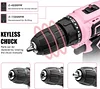 Functional Well-stocked Tool Box: Package including:Rechargeable power drill,2 lithium batteries,charger,drill bit accessories(10 drill bits+10 screw bits+extension bar),fashion pink storage bag.